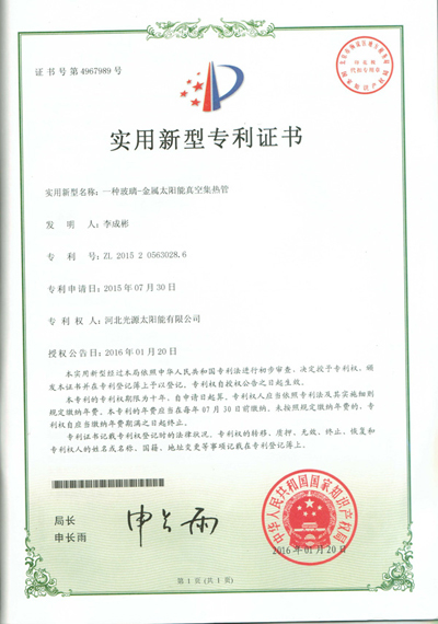 實(shí)用新型專(zhuān)利證書(shū)--一種太陽(yáng)能真空集熱管